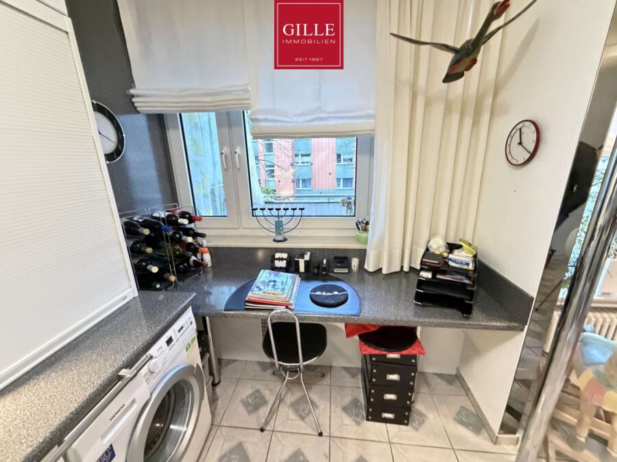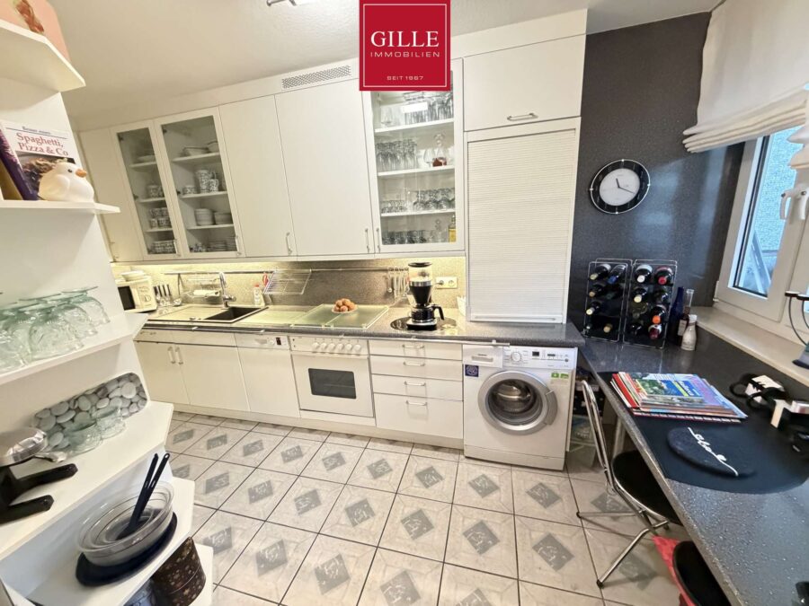 In der Wohnung befindet sich eine sehr große und helle Diele mit Garderobe und Zugang zum sehr großzügigen Wohn-Esszimmer. Das Wohn-Esszimmer ist zur Küche offen gestaltet und verfügt über eine sehr große Fensterfront zum Balkon. Die Küche ist sehr gut ausgestattet und bietet neben Kühlschrank, Spülmaschine und Backofen mit Glaskochfeld eine integrierte Waschmaschine.