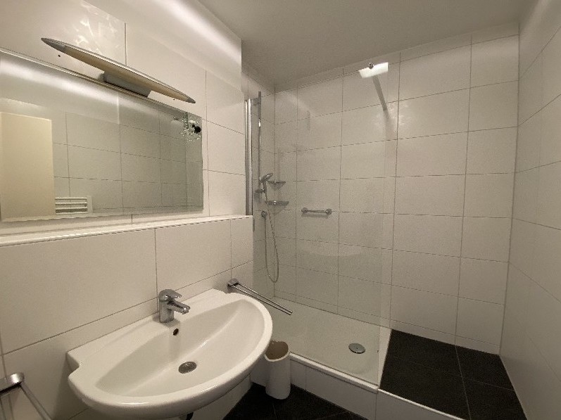 modernes Bad mit dunklen Bodenfliesen und weißen Wandfliesen, Dusche mit Glasabtrennung; separates, weiß gefliestes WC; Warmwasser über Durchlauferhitzer; teils überdachte Loggia; isolierverglaste Fenster, neue Gaszentralheizung BJ 2023, eigenes Kellerabteil, Fahrradkeller, Waschraum mit Waschmaschine und Trockner zur allgemeinen Nutzung via Münzeinwurf, Trockenraum, Aufzug, Hausmeisterservice, Treppenhausreinigung, Tiefgaragenstellplatz;