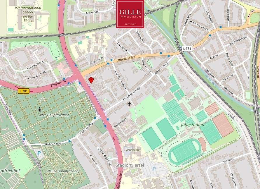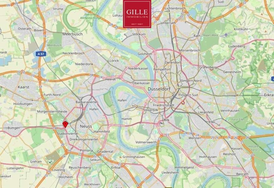 Die Innenstadt von Neuss ist bequem zu Fuß oder mit dem Rad in wenigen Minuten zu erreichen. Auf der Rheydter Straße fährt der nächste Bus in die Innenstadt und in 3 Minuten sind Sie auf der Autobahn A/57. Die Internationale Schule ISR befindet sich nur ca. 400m vom Objekt und auch das Schulzentrum an der Weberstraße ist mit dem Fahrrad in ca. 10 Minuten erreicht. Es besteht auch hier eine entsprechende Busverbindung.