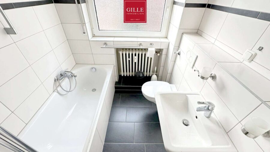 Das angrenzende helle und modern gestaltete Tageslichtbad ist mit einer Badewanne, einer Duschglasabtrennung, einem WC, einem Waschbecken einem Fenster und einem neuen Spiegelschrank versehen. Alle Sanitärgegenstände sind in weiß gehalten und bilden ein stimmiges Bild mit den weißen Wand- und den anthrazitfarbenen Bodenfliesen.