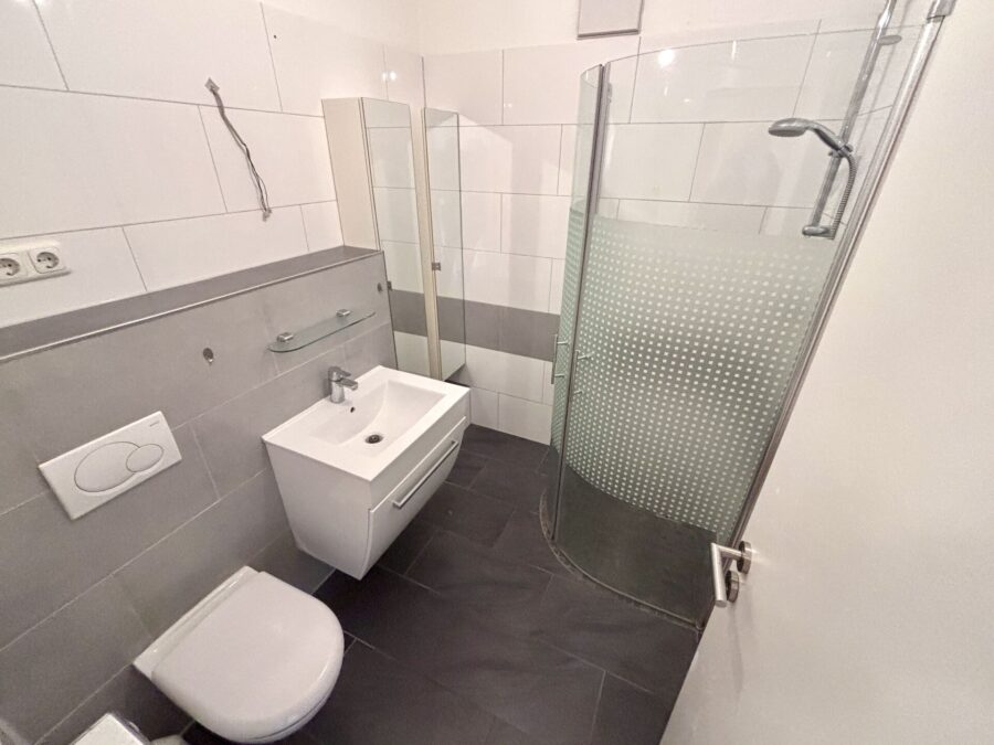 Das Wohnzimmer, die Diele, das Schlafzimmer sowie das Kinderzimmer sind mit Parkettboden ausgestattet. Das Badezimmer verfügt über eine bodengleiche Dusche, ein Waschbecken, ein WC sowie eine Lüftung. Die Sanitärobjekte sind in Weiß gehalten. Die Wandflächen sind mit weißen und grauen Fliesen versehen, der Boden ist mit anthrazitfarbenen Fliesen ausgelegt.