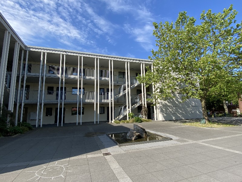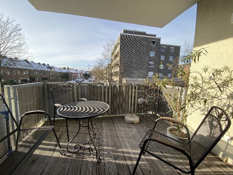 Vom gemütlichen Innenhof aus erreichen Sie ihre neue Wohnung sportlich über die Treppe oder bequem mit dem Aufzug. Im Inneren erwarten Sie helle, freundliche Räume, mit vielen Extras, wie Fußbodenheizung oder Schiebetüren. Das Wohnzimmer mit seiner breiten Fensterfront und die Küche sind offen gestaltet, so daß ein großzügiger Aufenthaltsbereich entsteht. Vom Wohnzimmer aus gelangt man auf die Terrasse mit Sonne ab dem frühen Nachmittag! Das Schlafzimmer ist nicht besonders groß, bietet aber ausreichend Platz um Bett und Kleiderschrank unterzubringen. Hervorzuheben ist das helle Bad mit Fenster und ebenerdiger Dusche! Zur Wohnung gehört ein Mieterkeller (auf der Wohnetage) und ein Stellplatz für Waschmaschine/Trockner im Waschkeller im EG.