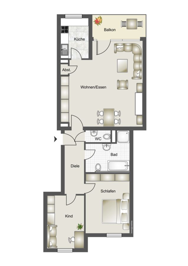 Die Wohnung verfügt über einen Flur, von dem aus alle weiteren Räume begehbar sind.