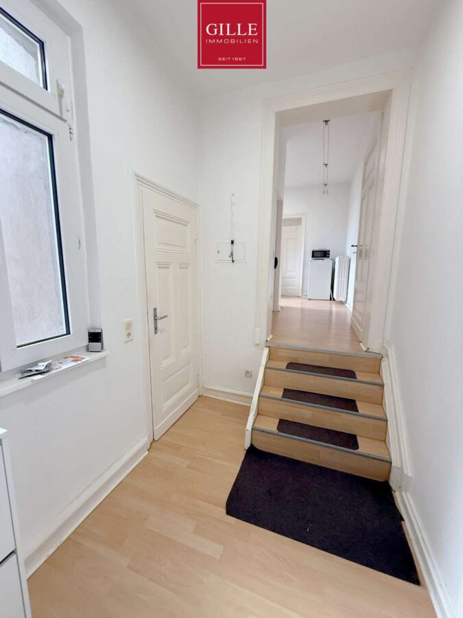Über 4 Treppenstufen erreichen Sie eine weitere Diele mit Zugang zum Duschbad, zur offen gestalteten Küche sowie zum Wohn- und Schlafraum.