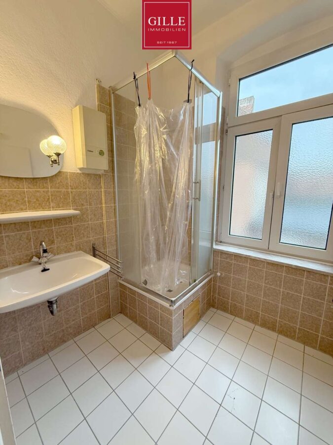 - Tageslichtbadezimmer mit Dusche inkl. neuer Glasduschabtrennung, Waschbecken und Waschmaschinenanschluss