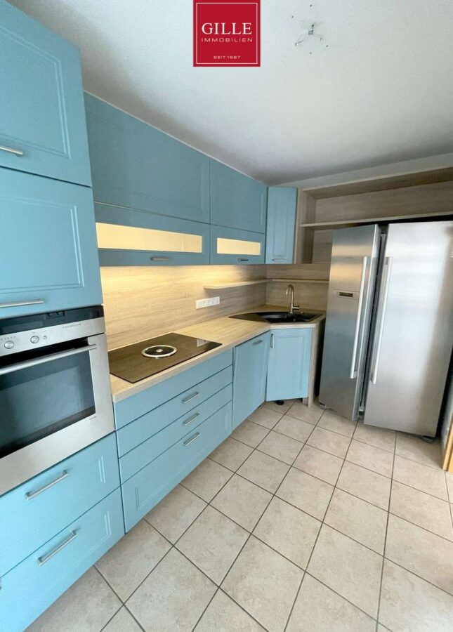 Die angrenzende Küche ist mit einem Fliesenboden und einer vollausgestatteten Einbauküche versehen und bietet Ihnen ebenfalls einen Zugang zur Loggia. Die abgebildete Einbauküche ist Bestandteil der Wohnung und in der Kaltmiete enthalten.