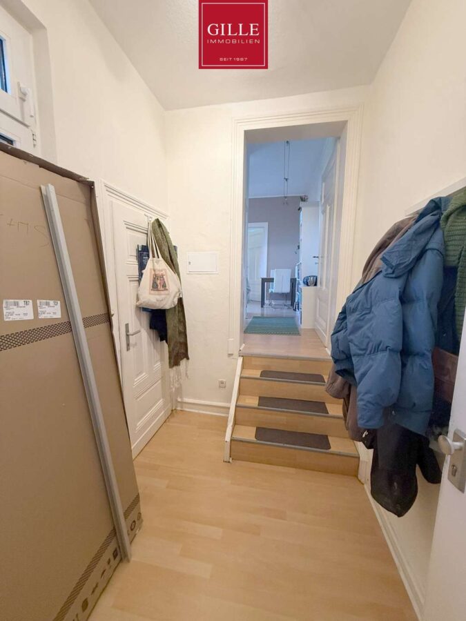 Über 4 Treppenstufen erreichen Sie eine weitere Diele mit Zugang zum Duschbad, zur offen gestalteten Küche sowie zum Wohn- und Schlafraum.