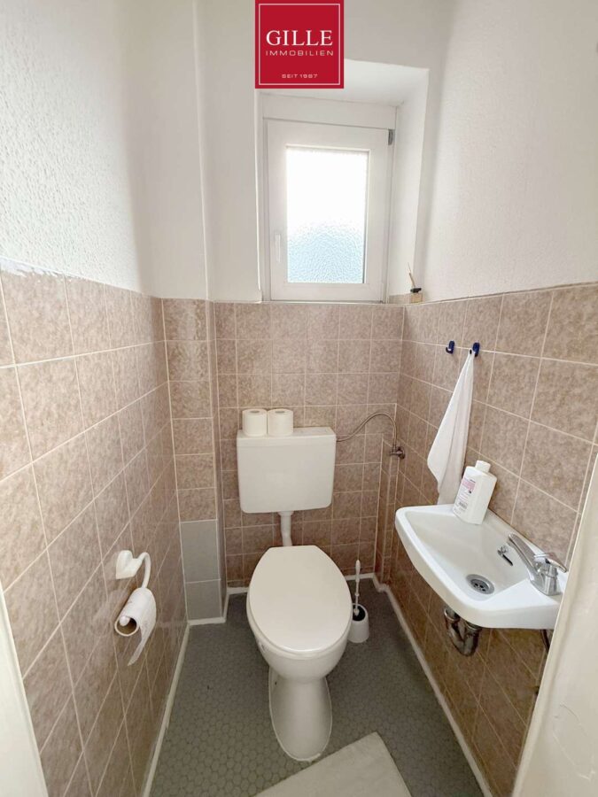 Der helle Eingangsbereich verfügt über ein Fenster und bietet Ihnen Zugang zu einem separaten WC. Das separate WC im Stil der 70er Jahre verfügt über ein Fenster, ein WC sowie ein Waschbecken.