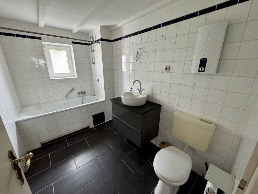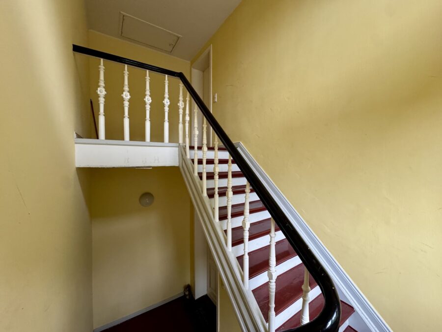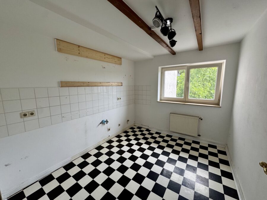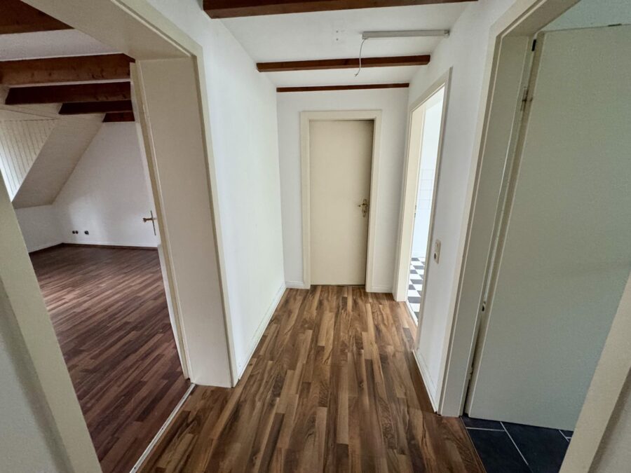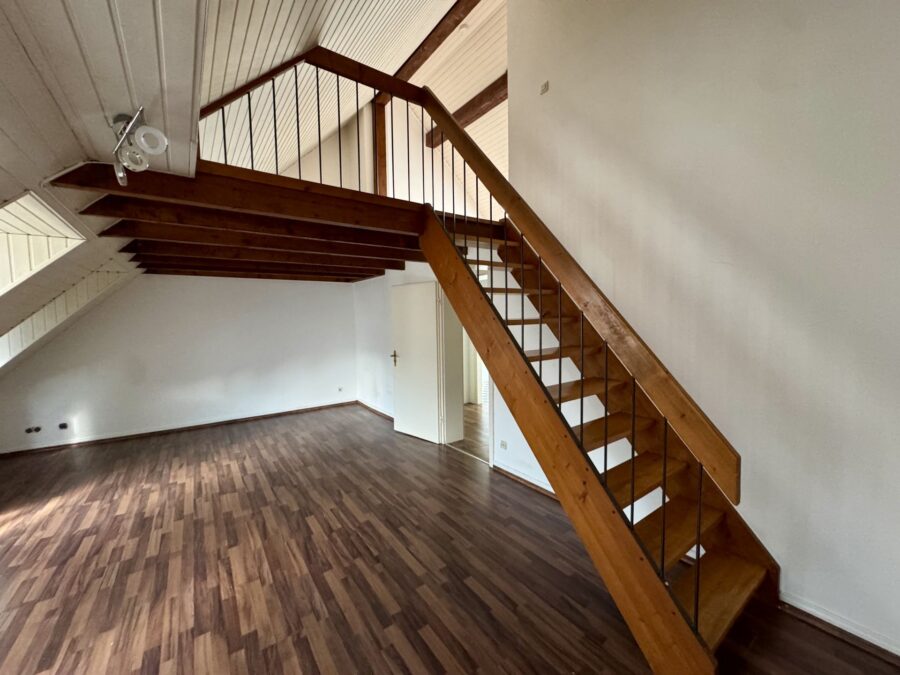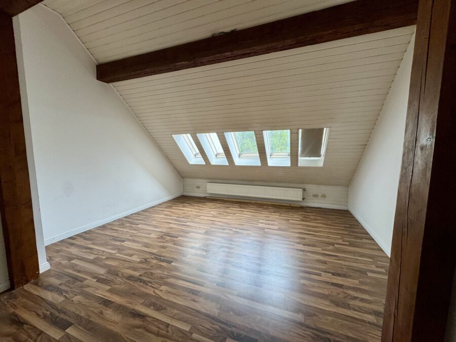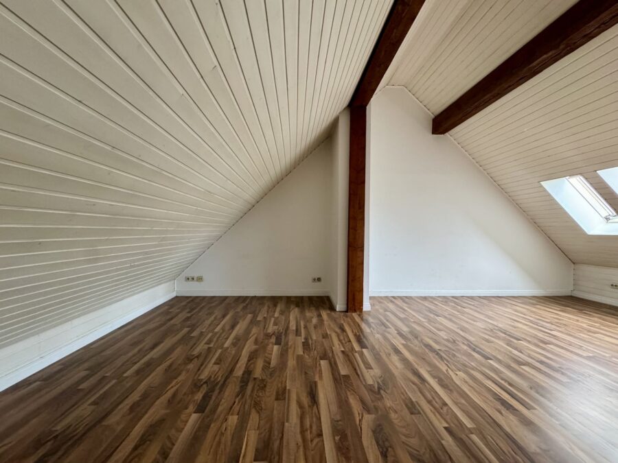 Die Wohnung erstreckt sich über zwei Ebenen und besticht durch ihren Altbau-Charme: Sichtbalken, Dachschrägen und ein klassischer Grundriss verleihen der Einheit eine besondere Wohnatmosphäre.