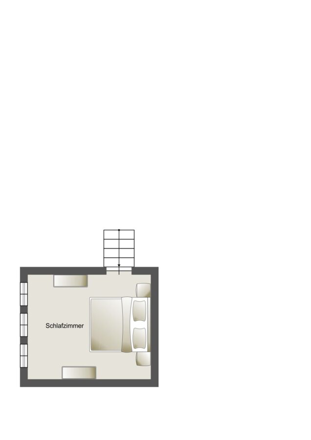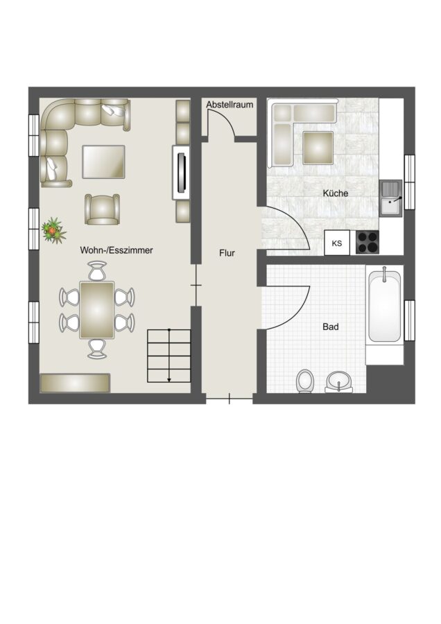 Das Herzstück bildet der großzügige Wohn- und Essbereich, ergänzt durch ein Schlafzimmer im Spitzboden sowie ein Badezimmer und die Küche. Ebenfalls steht ein Abstellraum zur Verfügung.