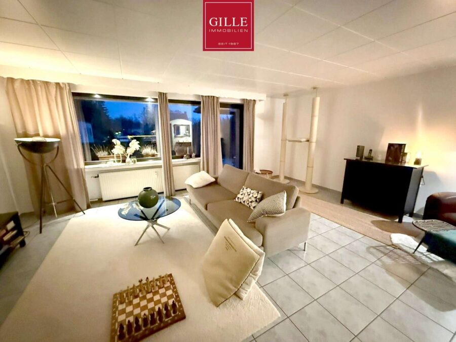 Der Wohn-Essbereich ist durch einen Rundbogen mit der Eingangsdiele verbunden und bietet Ihnen aufgrund der großen Fensterfront viel Tageslicht. Er ist ebenfalls mit einem hellgrauen Fliesenboden und einem tollen Kaminofen ausgestattet. Von hier aus haben Sie Zugang auf die sehr große Dachterrasse.